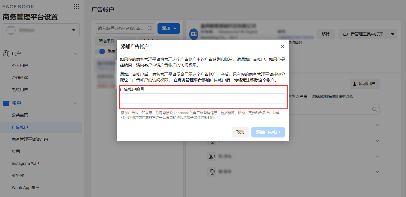 8.添加广告账户编号,完成广告账户的设置,即可在【广告管理工具】下创建和投放广告。
