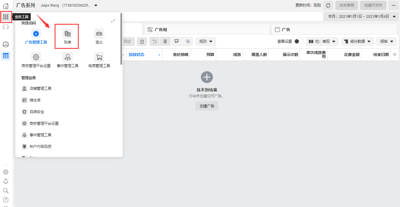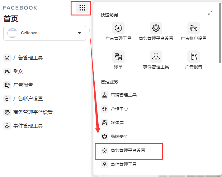 5.广告账户需要在【商务管理平台设置】下创建;