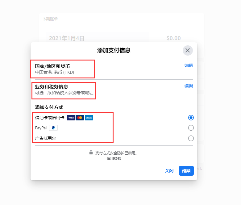 6.完善支付的国家或地区、货币、业务和税务信息,以及支付方式;