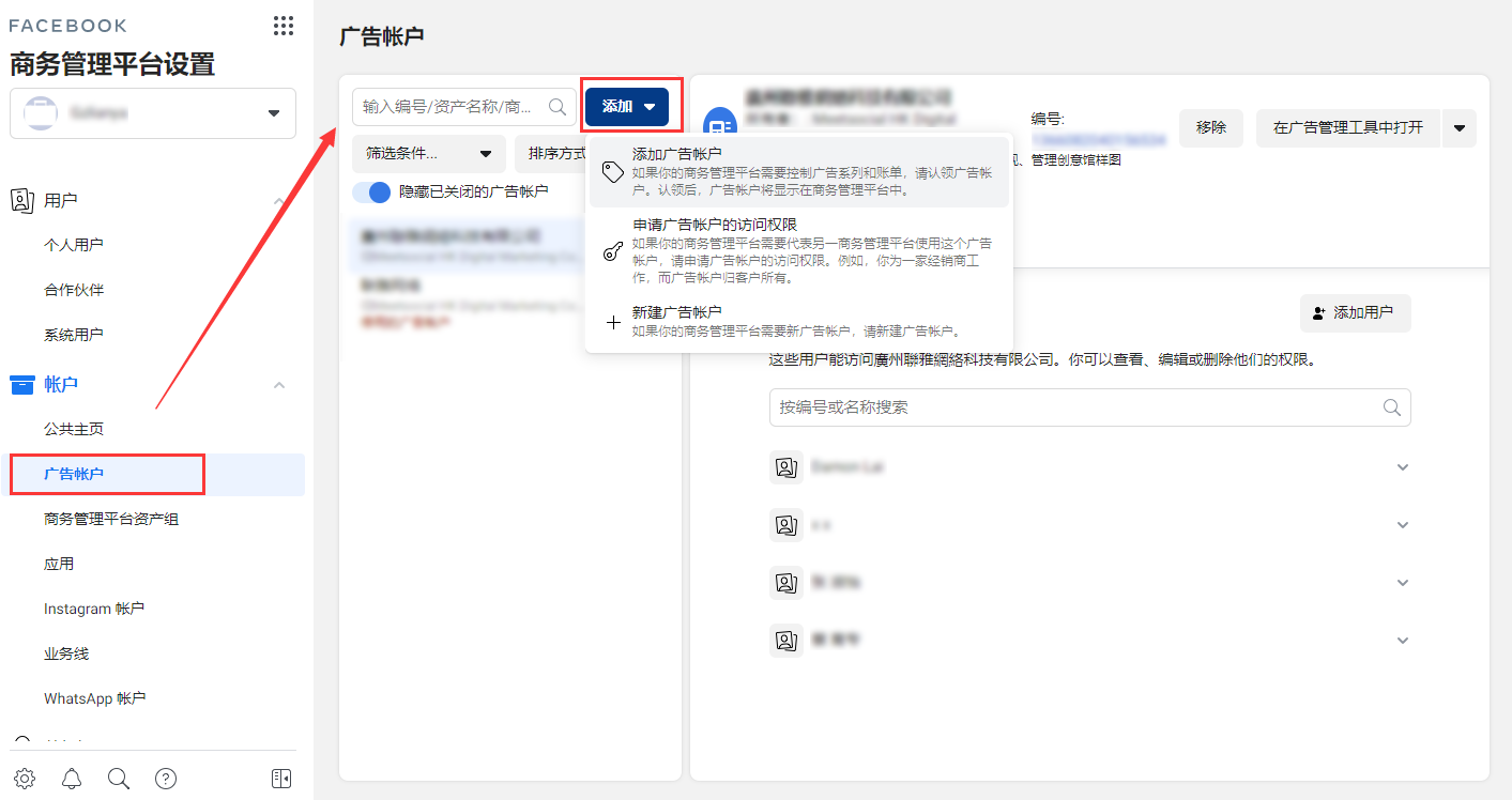 7.添加广告账户,可通过添加和创建三种方式;