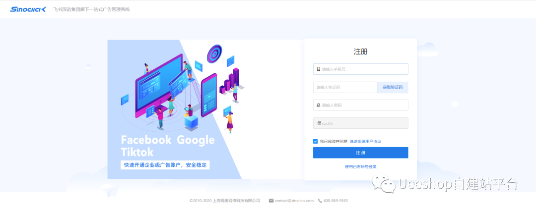 Ueeeshop为能够帮助独立站卖家更好解决广告开户及广告管理的难题,联合战略合作伙伴飞书深诺,为卖家提供自助开户服务的快捷通道,只需要在Ueeshop自建站系统的后端管理系统,即可完成自助广告开户,目前可以支持Google和Facebook的企业广告开户。