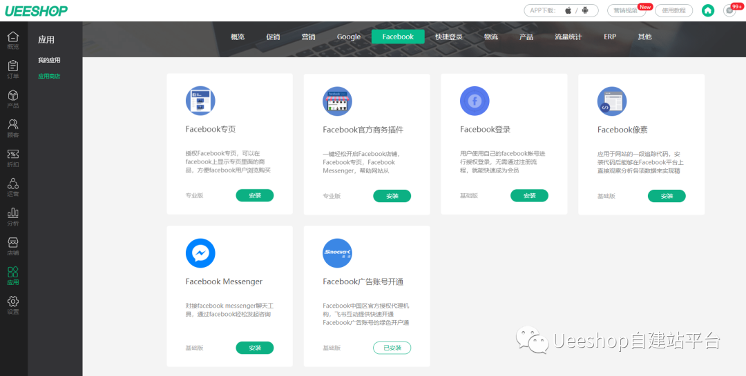通过Ueeshop自建站系统后台,除了可实现极速广告开户通道,同时Ueeshop还整合一系列Google和Facebook运营所需功能,如:Facebook商务插件功能(Facebook主页及店铺绑定)、Facebook像素管理、Facebook Messenger、Google Feed、Gooogle Analytics等等。一键安装授权即可启动。