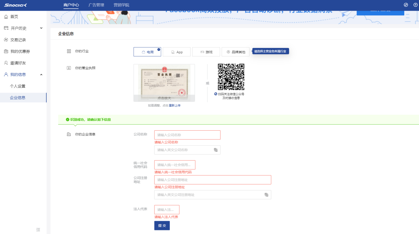 第三步:填写注册资料(请提前准备好企业营销执照图片以便审核,像素不低于600*600),备注:填写公司名称、注册法人、统一社会信用代码等企业相关资料,快速完成注册。