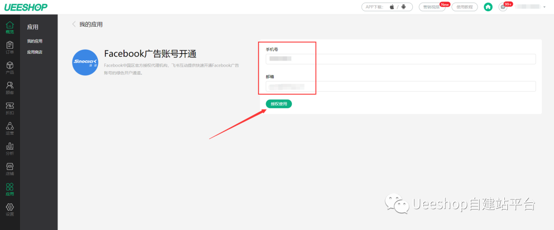 第一步:登录Ueeshop后台账户,并打开“应用中心-Facebook广告账户开通”的安装启动应用。
